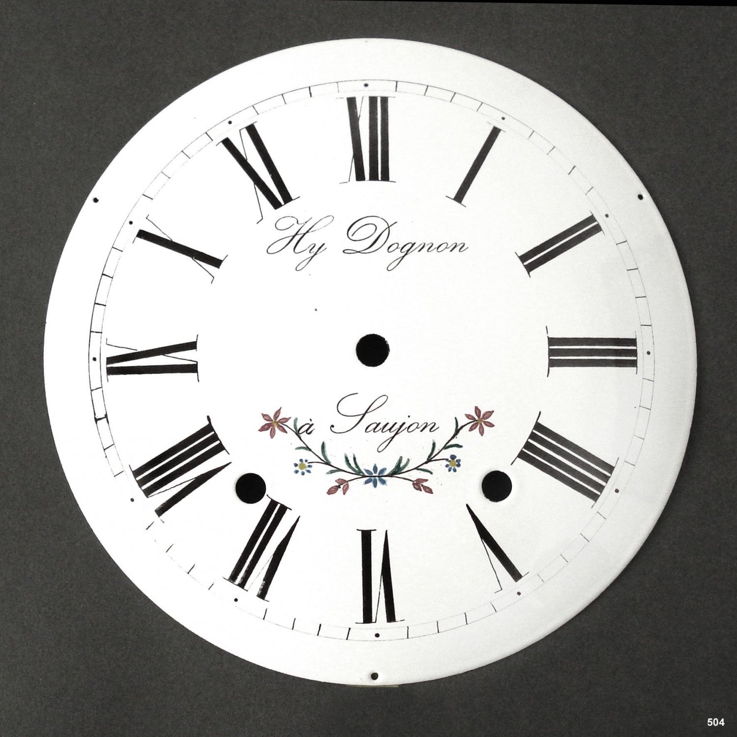 Wijzerplaat voor 19e eeuwse comtoise klok. Gesign: Hy Dognon à Saujon.