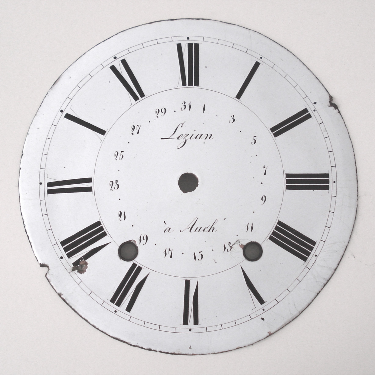 Antieke wijzerplaat voor comtoise klok met datummechniek. Gesign. Lezian à Auch.